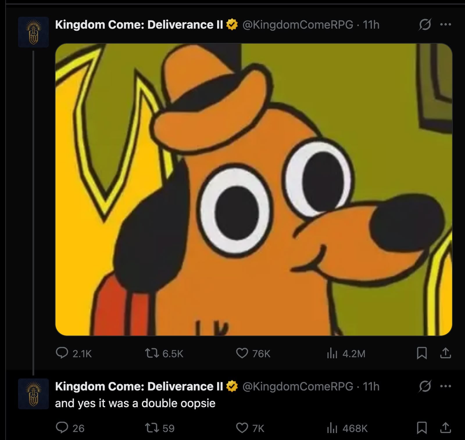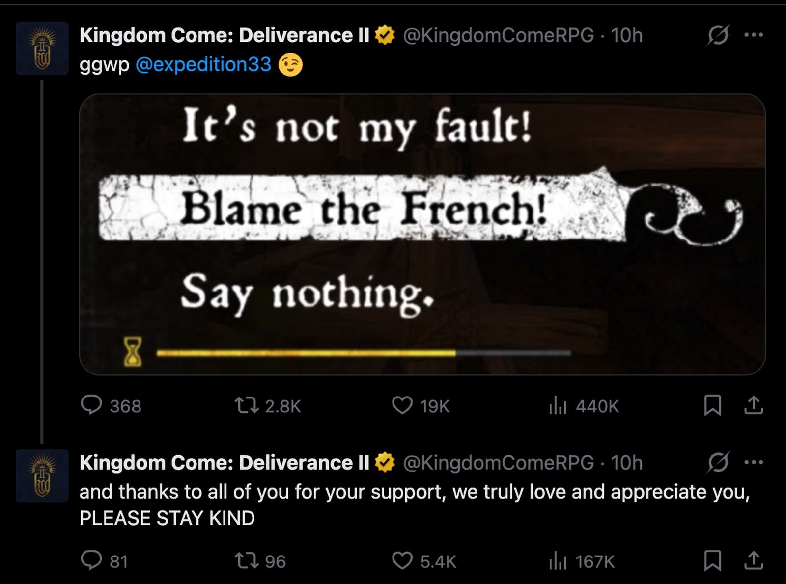 面對失利,官方 X(前 Twitter)帳號以幽默方式回應,貼出經典梗圖「This is Fine」中小狗身處火海仍淡定飲咖啡的畫面,充滿自嘲意味。隨後,官方再發布一張遊戲截圖,選項為「都係法國人害嘅!」,並向《光與影:33號遠征隊》團隊送上祝賀,展現友好競爭的態度。