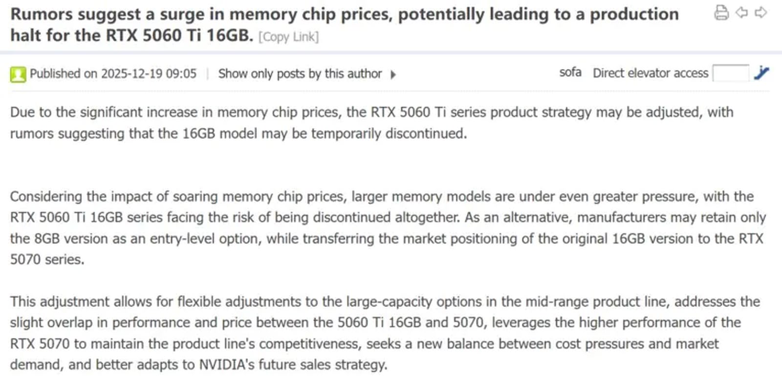 事實上,自上月起記憶體供應進一步緊張,RTX 5060 Ti 16GB 已明顯較難於零售市場入手。